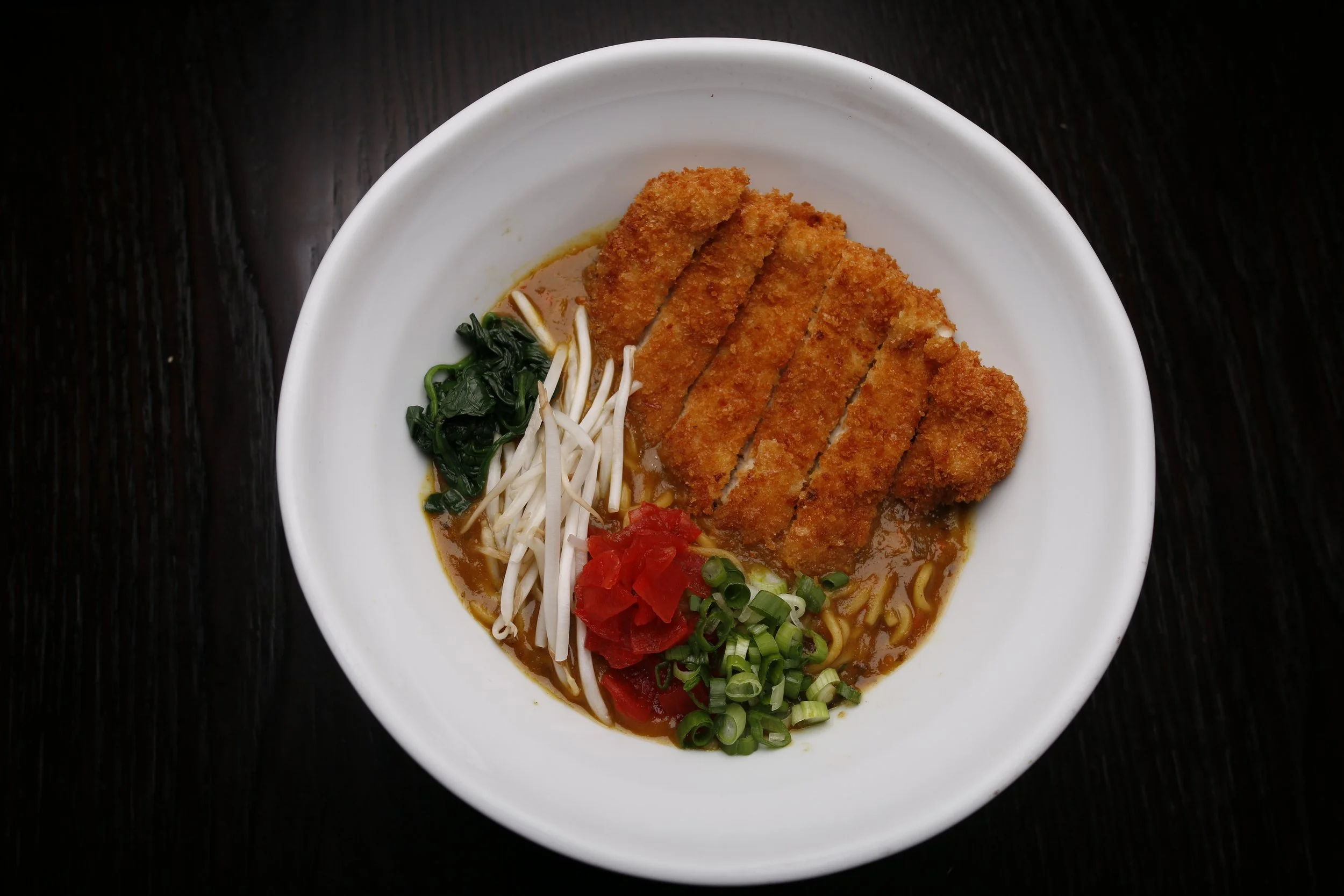 Veggie Broth with Premium Japanese Curry, Thick Wavy Noodle, Chicken Katsu, Spinach, Shredded Cabbage, Fukujin-zuke, and Green Onion (without Katsu Option available for Vegetarian)